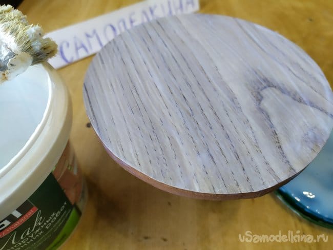 После того, как хорошо и тщательно взболтали лак, берем кисточку и хорошенько проходим края. Заодно я решилась пройти и по верхушке подставки, лишним не будет. Проходить низ, нужды нет, но если сильно хочется, то можно. Самое главное, следите, чтоб лака не было много, мажем мы жирно, но затем кисточкой сметаем все подтеки. Лучше некоторое время посидеть и понаблюдать, потеки скорее всего появятся.