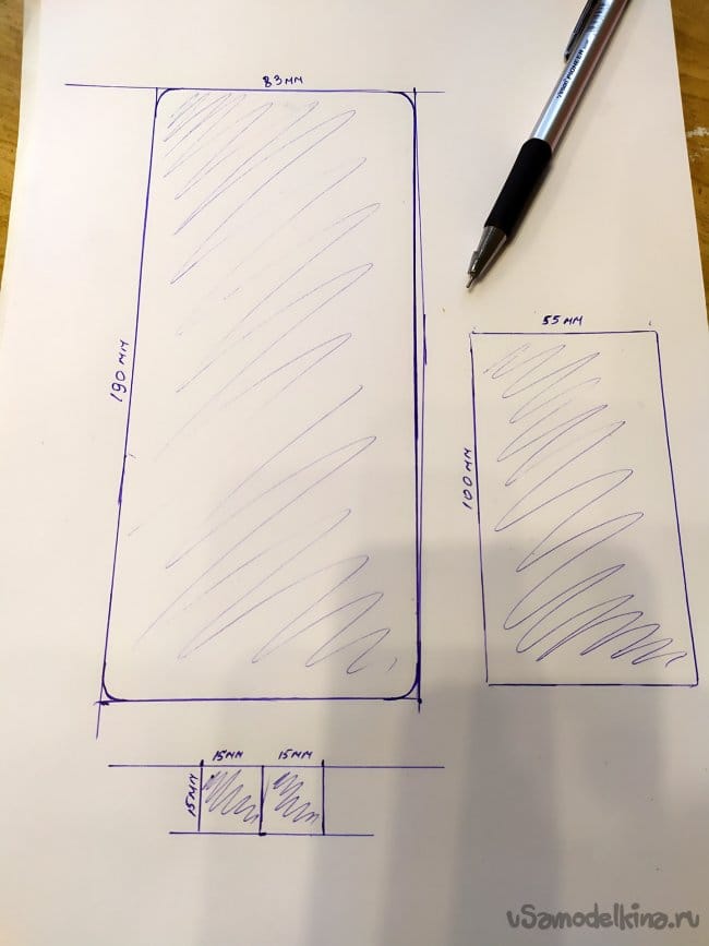 Теперь, нам нужен трафарет. Берем лист бумаги А4, ручку и линейку, и рисуем все детали.