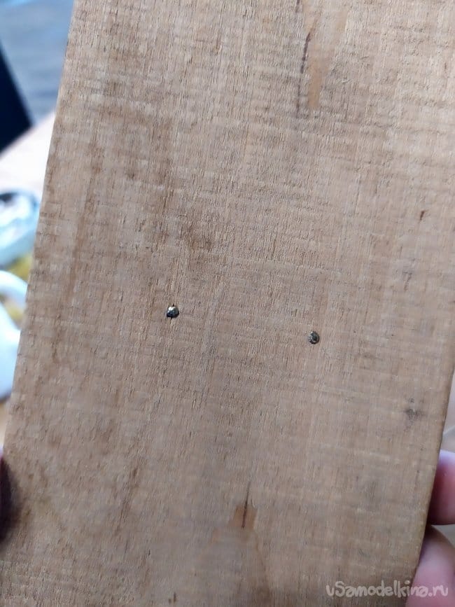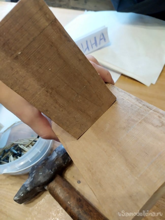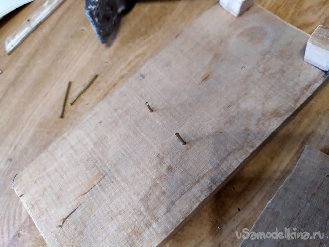 Когда клей высохнет, начинаем заниматься задней частью,ножкой. Так как на нее будет упираться вся масса, то одного клея тут недостаточно. Поэтому, делаем отметки для гвоздей. Гвозди нужны длинные, чтоб смогли хорошенько слепить обе части. У меня гвозди по 30мм. длиной. Примерно по середине рисуем две точечки, это наши отметки. Начинаем забивать пока только в главную деталь, в наше основание.