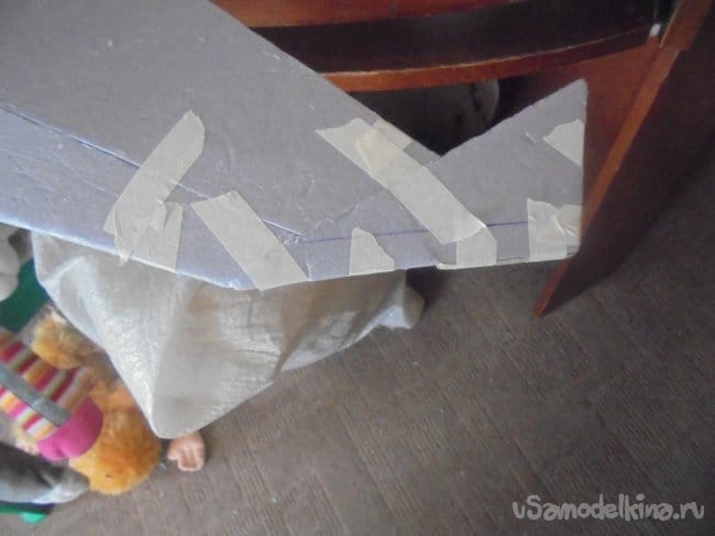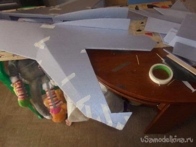 По мере высыхания клея на смонтированных элементах, начал локальную обтяжку цветным скотчем.