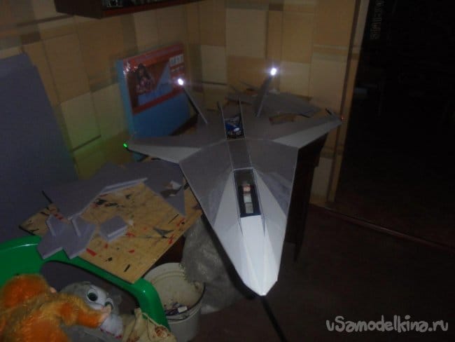 Первым делом я сварганил фонарь для кабины из пластиковой бутылки и посадил в неё пилота.