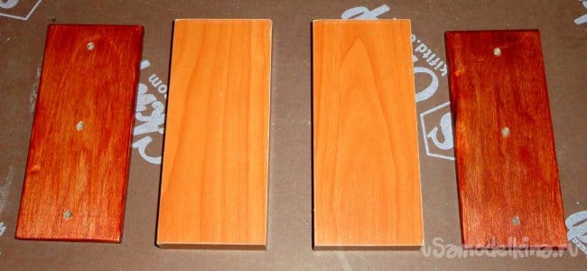 Дополнительные опоры для колес выдвижных ножек из ЛДСП имеют размеры 130х55мм. Для увеличения ширины крепления под колеса вырезаны прокладки из фанеры толщиной 6мм. Фанера обработана быстросохнущим лаком ХВ-784.
