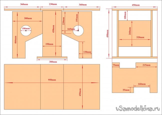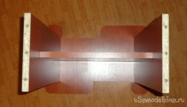 Рассчитывая размеры своей конструкции, исходил из размеров имевшихся обрезков ЛДСП и минимального количества необходимых распилов. Цветовая гамма изделия получилась «груша» + «вишня».