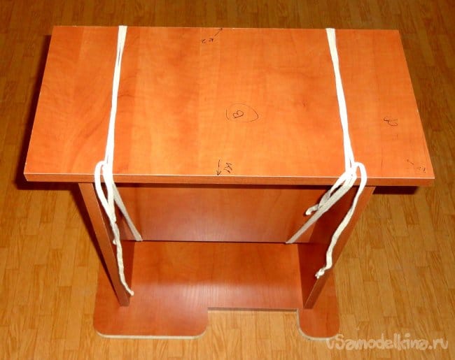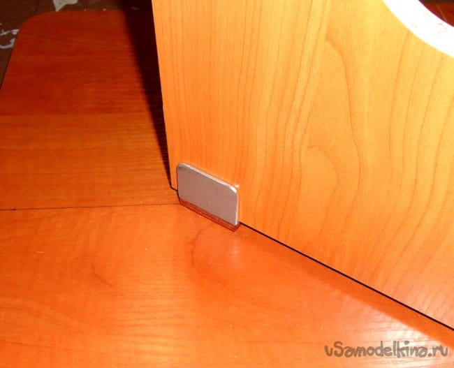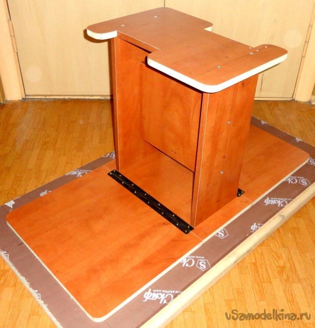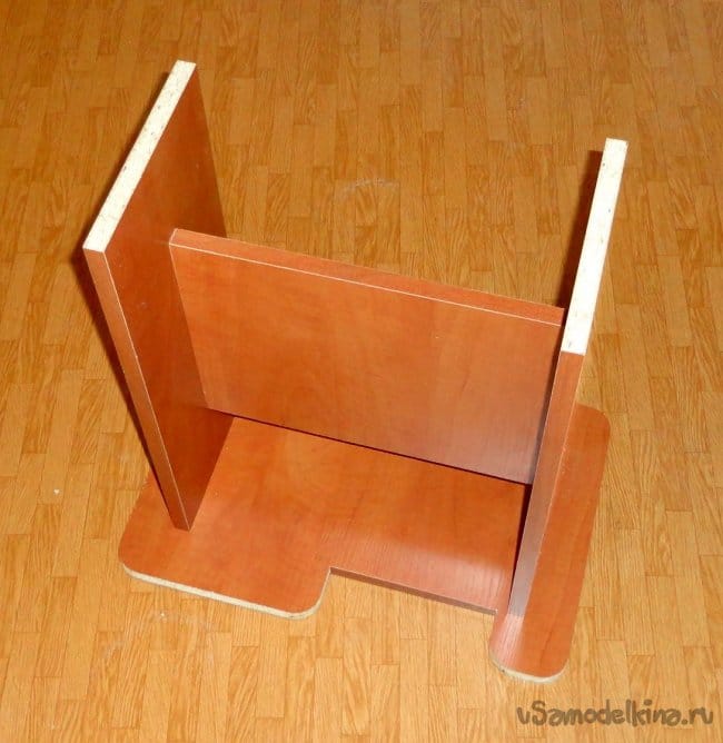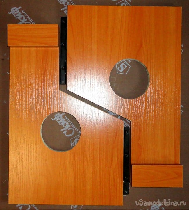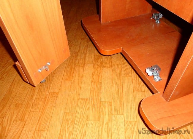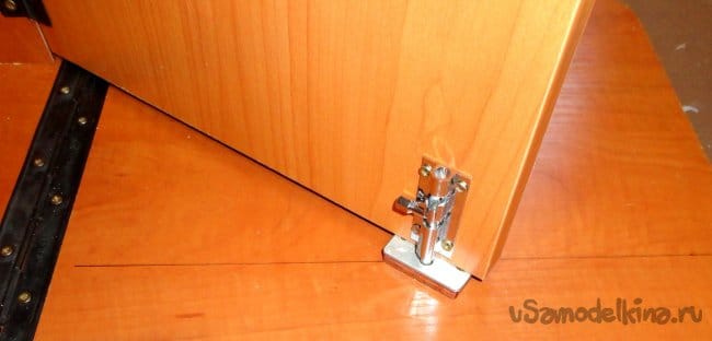 Для точности крепления выдвижных ножек к боковым стойкам, как и ранее, использовалась ровная плоскость (обрезок кухонной столешницы).