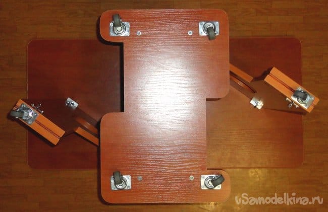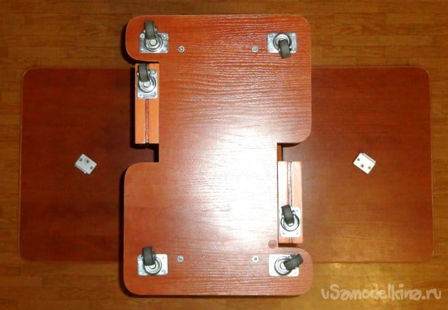 С использованием ровной плоскости выставлены роликовые защелки ножек, которые обеспечивают отсутствие «болтанки» при перекатывании столика в сложенном состоянии.