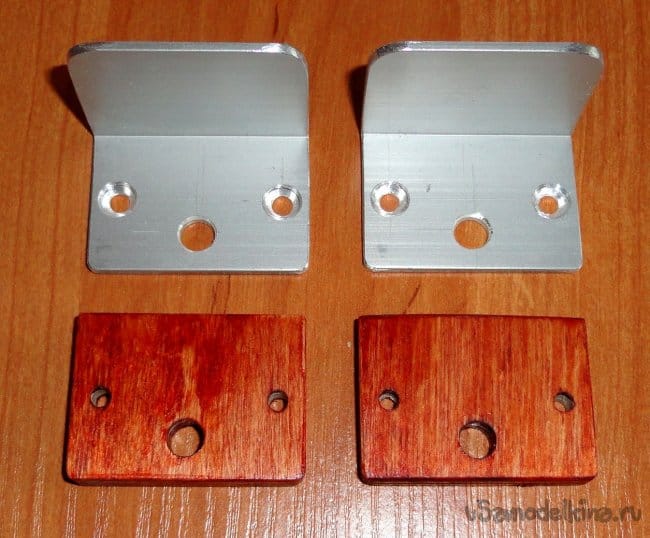 Фиксаторы выдвижных ножек изготовлены из алюминиевого уголка 30х30х2мм длинной 40мм и кусков фанеры 40х30х6мм. Фиксаторы на боковых частях столешницы закреплены шурупами.