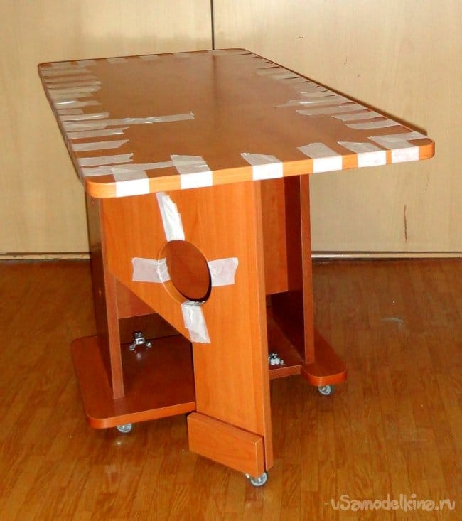 Так, как имевшегося ПВХ профиля хватило только на столешницу, то основание столика отделал кромкой с клеевой основой (в качестве нагревателя использовал утюг).
