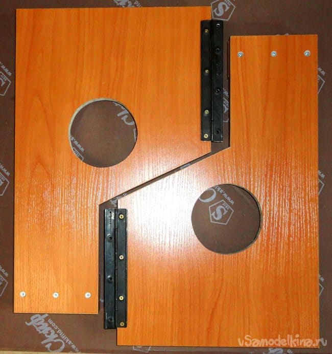 Оставшиеся части петель длинной 180мм и дополнительные опоры для колес закреплены на выдвижных ножках шурупами.