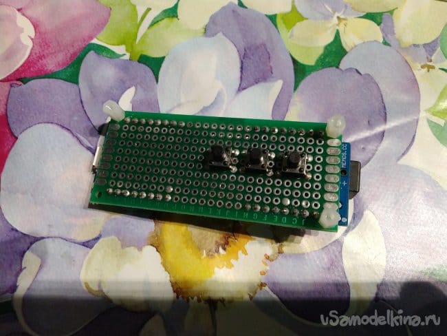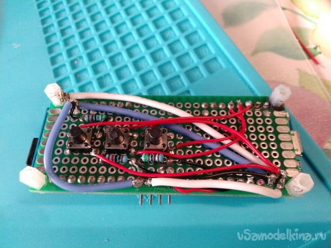 В итоге лицевая сторона платы с кнопками, резисторами и проводами выглядит следующим образом: