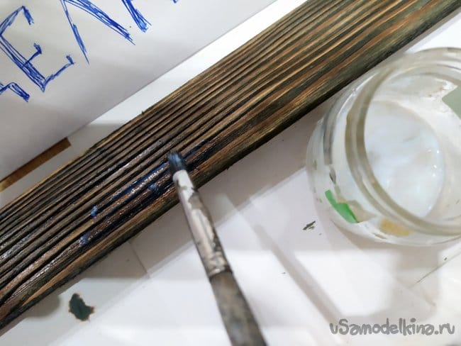 Теперь, завершающим этапом, нужно закрепить эффект лаком. Я использую акриловый матовый лак. Для того, чтобы кисточка не запачкала лак, лучше отлить немного в баночку. Теперь все хорошо промажем. После высыхания первого слоя(это примерно час), можно нанести еще слой. Это защит дерево и увеличит его срок службы.