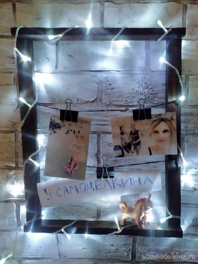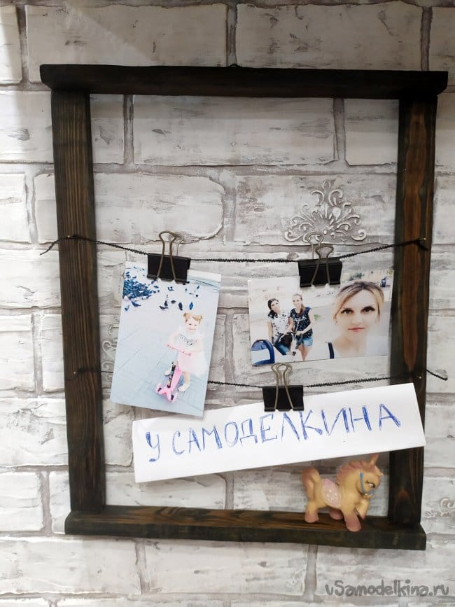 Теперь, вешаем нашу раму на стену. На нитки цепляем скрепки, либо прищепки, я использовала зажимы для бумаги. Вешаем фотографии. На верх и низ можно поставить небольшие предметы.