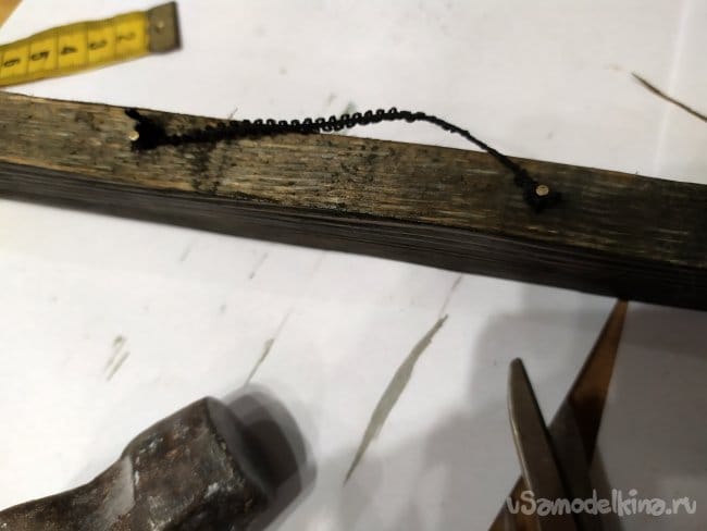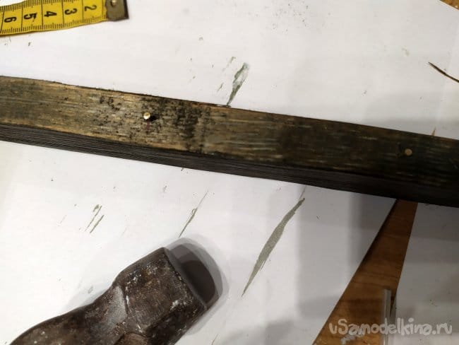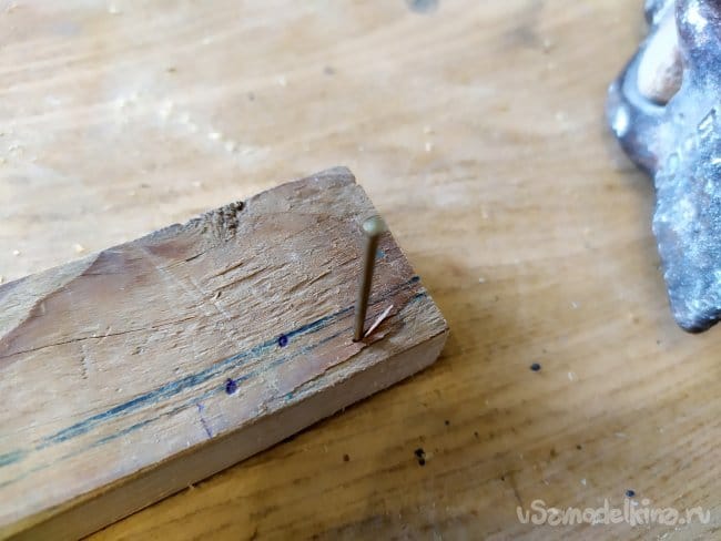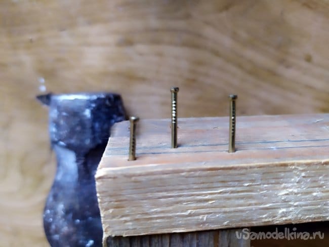 Теперь осталось завершить мелочи. Моя высота полочки позволяет натянуть две веревки для фотографий. Поэтому, по бокам, на одинаковом расстоянии, я вбиваю 4 гвоздика. Полностью забивать не нужно, должен остаться кончик, для того чтобы завязать веревку.