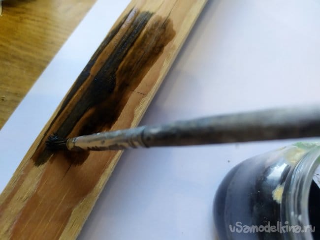 Морилку наливаем в небольшую емкость, и тоненькой кисточкой начинаем красить.