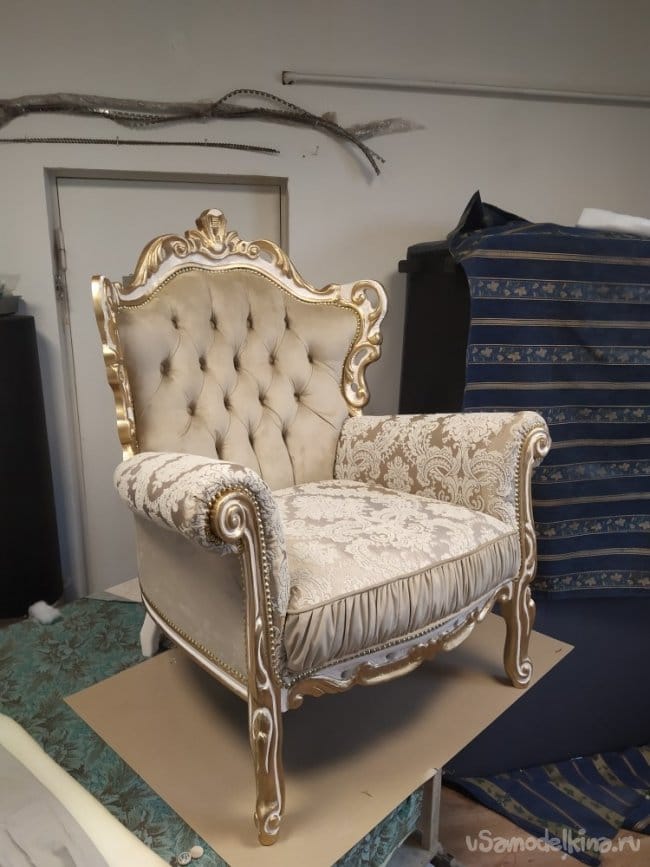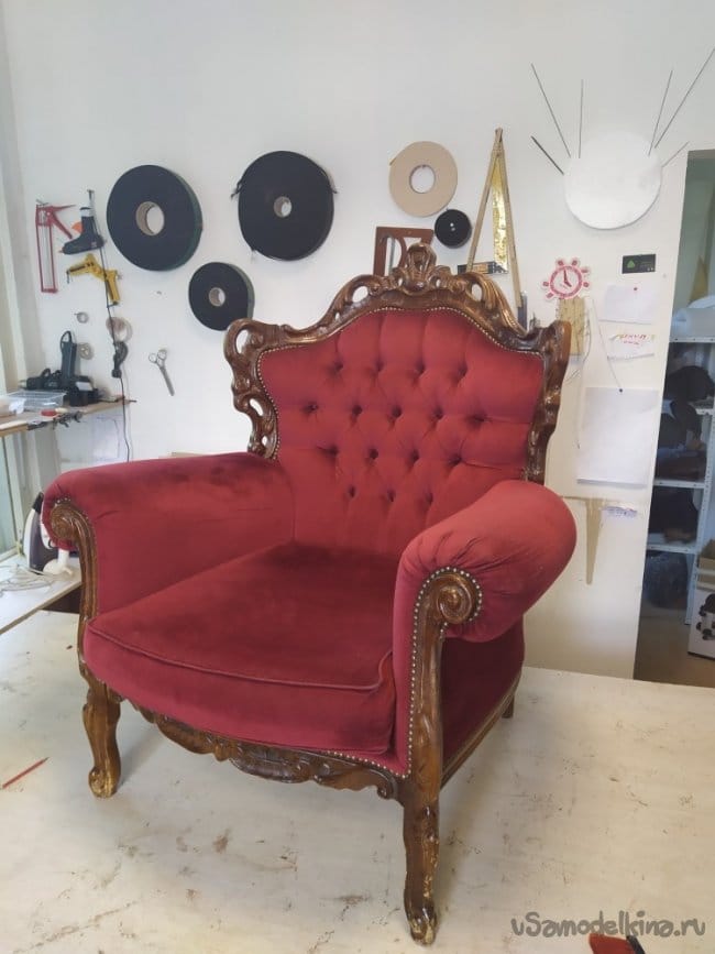 После установки ткани необходимо закрыть тканью кресло снаружи сзади. Работа очень сложная и кропотливая. И вот что в итоге получилось.
