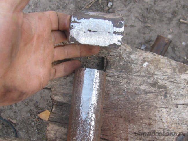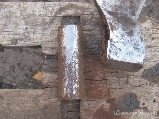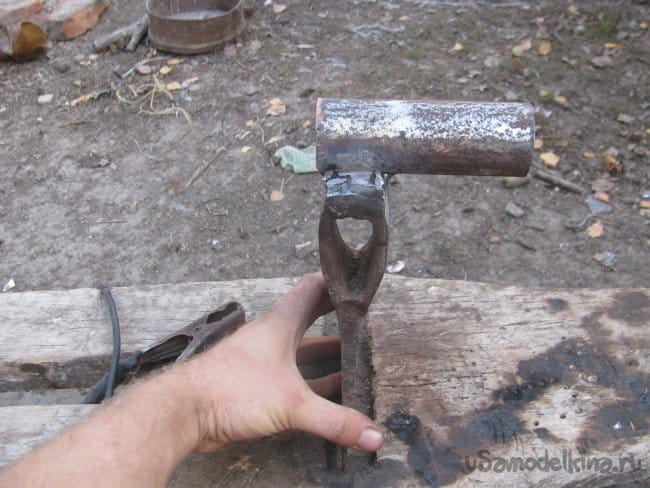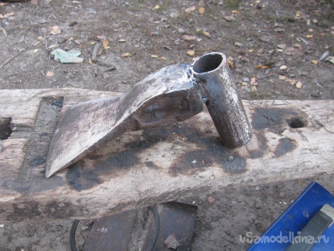 Зачищаем топор, а также отрезаем кусок трубы, в которую будет вставляться черенок. Трубу выбираем с толстой стенкой, чтобы все держалось крепко. Стыкуемые поверхности немного вывел болгаркой в плоскость, дабы получить бОльшую. Площадь соприкосновения и хорошо все сварить.
