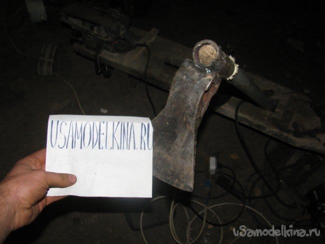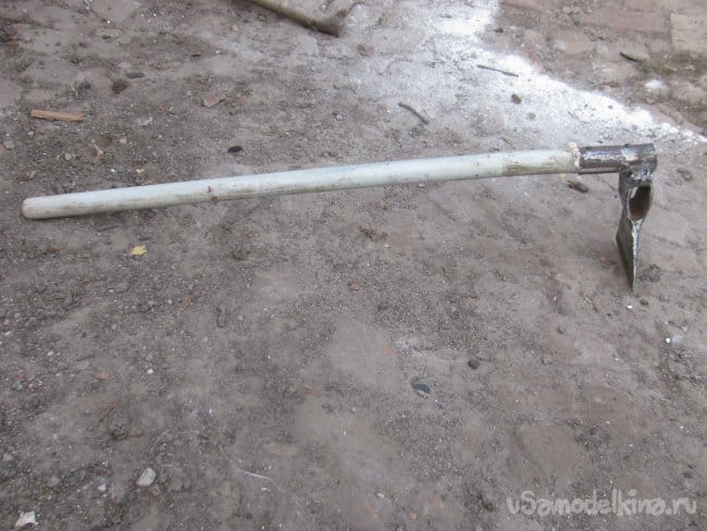 В руках мотыга вполне удобная, правда, коротковат черенок, нужно будет купить нормальный. Инструмент центрируется сам, лезвие всегда стоит четко вниз за счет веса. Черенок установлен к топору под прямым углом, если вам нужно именно выгребать инструментом, нужно завалить лезвие немного к себе, чтобы получилась лопатка. Сам раньше никогда кирку в руках не держал, так что сравнить не с чем. На сборку ушло 30 минут, 2 электрода (3 мм) и четверть круга болгарки.