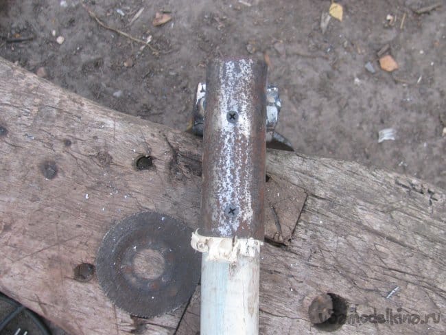 Немного подточил черенок ножом и хорошенько его запрессовал в трубу, зашел плотно, люфтов нет. Просверлил в трубке два отверстия и загнал на всю длину саморезы. Все держится вроде крепко. Нагрузки тут не будут больше, чем у штыковой лопаты.