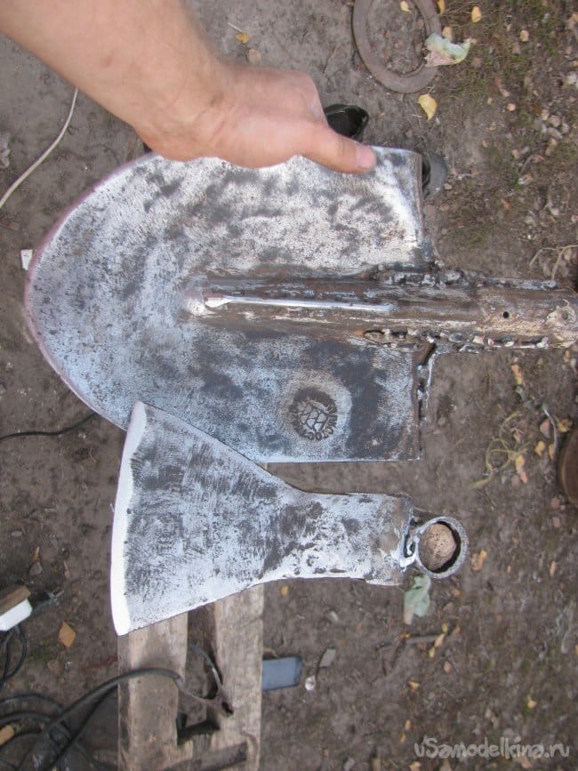 В завершении затачиваем топор, скорее всего такую мотыгу нужно точить спереди, то есть, спуск должен быть один, но я пока не определился, как лучше. Точим шлифмашиной или болгаркой.
