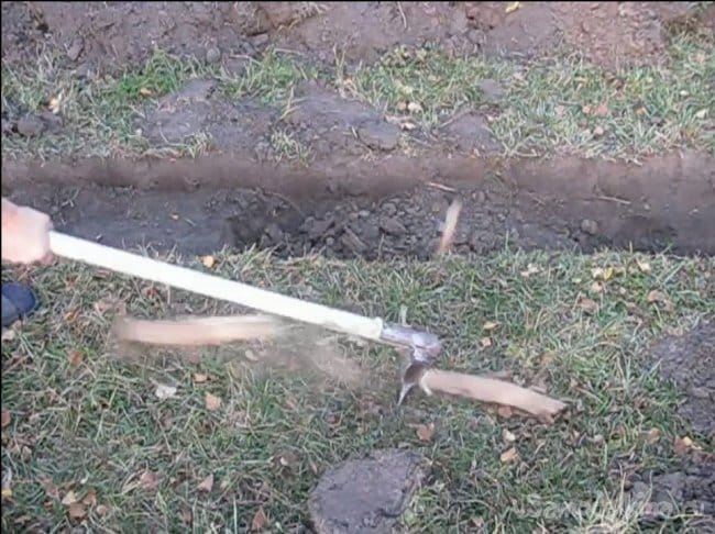 Самоделка прекрасно пробивает этот плотный слой, который я не мог взять лопатой, это мне и нужно. Что касается усилий, то это не сложнее, чем работать штыковой лопатой. Также топор прекрасно рубит корни, ветки, кирпичи, да и все, что будет стоять на пути, вопрос только прочности стали.