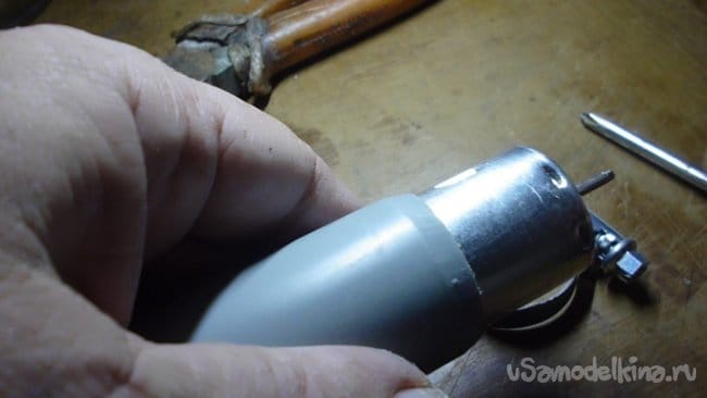 Немаловажной деталью мини дрели, где размещаются и крепятся все комплектующие является корпус. Вариантов множество, в нашем случае используется трубка из фановой трубы, внутренний диаметр которой, как нельзя лучше совпал с наружным диаметром электро двигателя. При фиксации в корпусе двигатель встал практически без зазоров.
