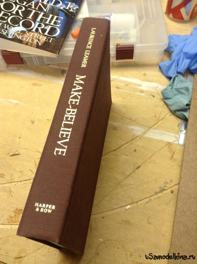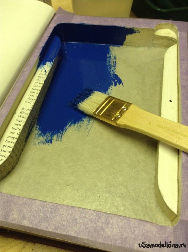 Перед тем, как приступить к отделке “интерьера”, проклейте страницы книги в месте входного разреза пилы клеем ПВА или суперклеем. Подойдет любой клей, работающий с бумагой. Снимите вощеную бумагу с задней обложки и приклейте ее к страницам. Для этого хорошо подойдет детский клей в стиках, так как он не растекается и отлично фиксирует. Опять отложите книгу в сторону с чем-то тяжелым сверху, чтобы она просохла.