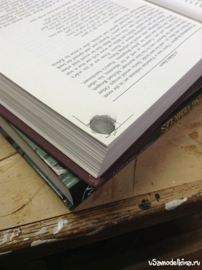 Для магнита, начните прорезать отверстие примерно на 8 странице книги. Для магнита достаточно 3-7 мм в зависимости от его толщины. Так как странички меньше по размеру, чем обложка, центр магнита должен отступать примерно на 9-10 мм от краев страниц. В моем случае, книга по размеру ненамного превышает сам планшет, поэтому магнит довольно плотно прилегает к краям. В принципе, его можно поместить куда угодно, лишь бы он не стоял на линии разреза пилой. Когда магнит будет закреплен, проклейте сверху него 3-4 странички, чтобы спрятать и не дать ему выпасть. На следующем этапе мы проклеим края книги.