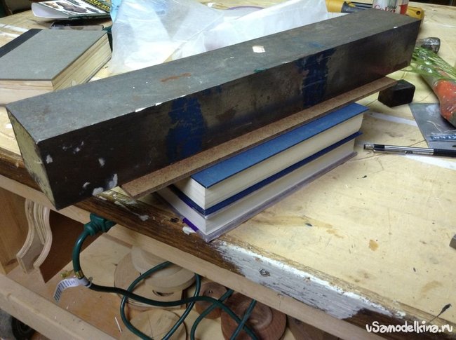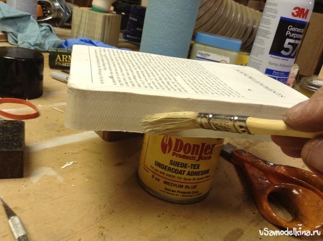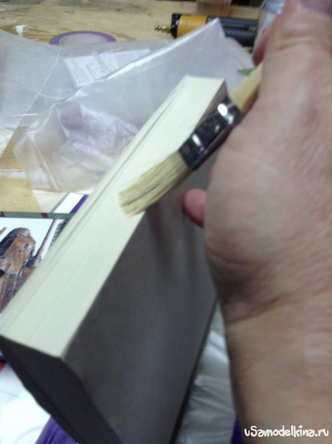 Когда обложки защищены, смешайте 2 части клея ПВА и 1 часть воды. Нам нужно получить жидкий клей, и пропорции этой смеси не критичны. Просто нанесите эту смесь кисточкой на внешние торцы страниц. Я делаю это в несколько слоев, обильно смочив края страниц клеем. Когда этот процесс окончен, закройте книгу и положите сверху что-то тяжелое, чтобы странички не начали топорщиться гармошкой. В таком положении книга должна полностью высохнуть, лучше всего будет оставить ее так на ночь.