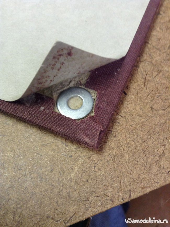 Чтобы сделать замок для будущего кейса, лучше перед всеми остальными операциями закрепить магнит и металлическую шайбу. В уголке обложки отодвиньте покрытие и пометьте карандашом место расположения шайбы. Убедитесь, что это место не выходит за край страниц, так как в толщу страниц нужно будет встроить магнит для замка, строго напротив шайбы. Центр шайбы должен примерно на 12 - 15 мм отступать от краев обложки. Ножом прорежьте картонную обложку книги и вклейте шайбу внутрь, затем приклейте покрытие обратно.