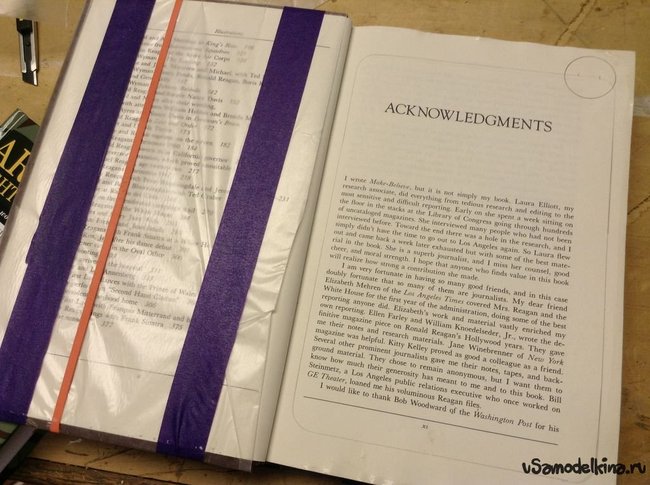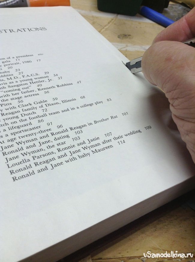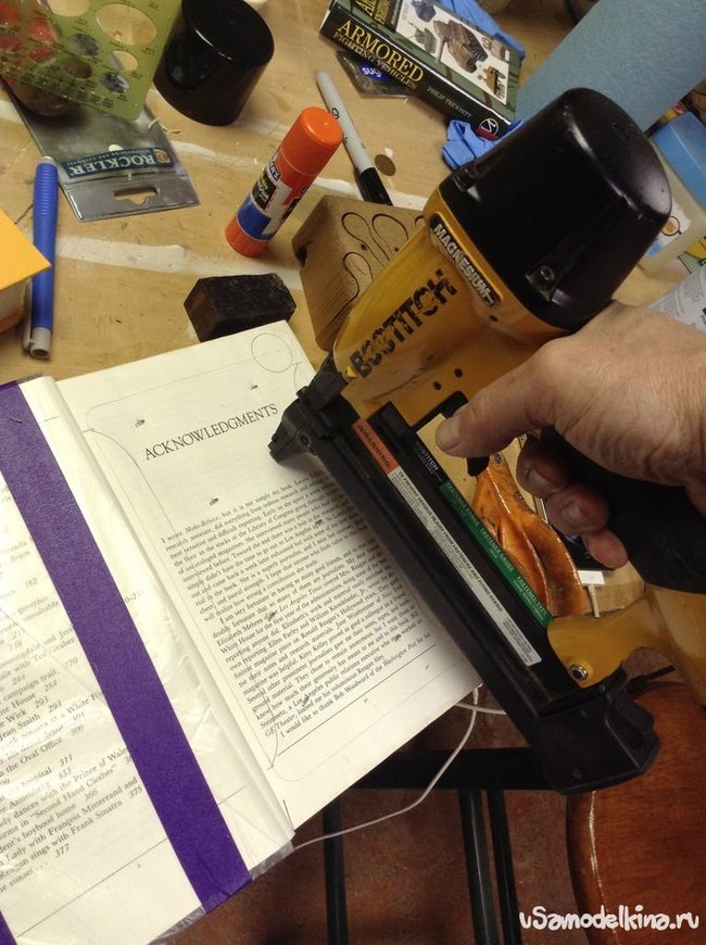 Чтобы странички не разлетались после вырезания, нужно скобами или гвоздями их скрепить вместе. Я потратил 6-8 скоб, которых хватило примерно на ¾ толщины книги. Поэтому лучше скрепить толщу страниц спереди и сзади.