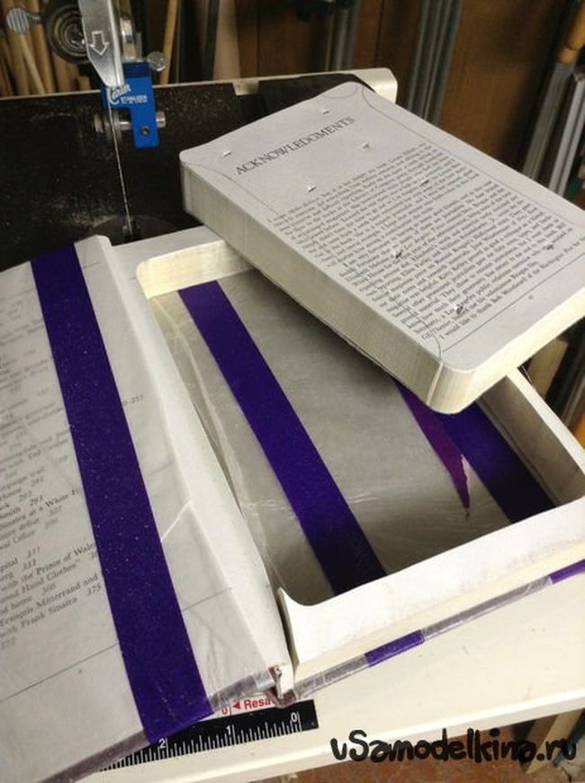 Сделайте еще одну смесь жидкого клея для наружных краев выпиленных страниц. Обработайте их с внешних сторон и дайте им просохнуть под чем-то тяжелым.