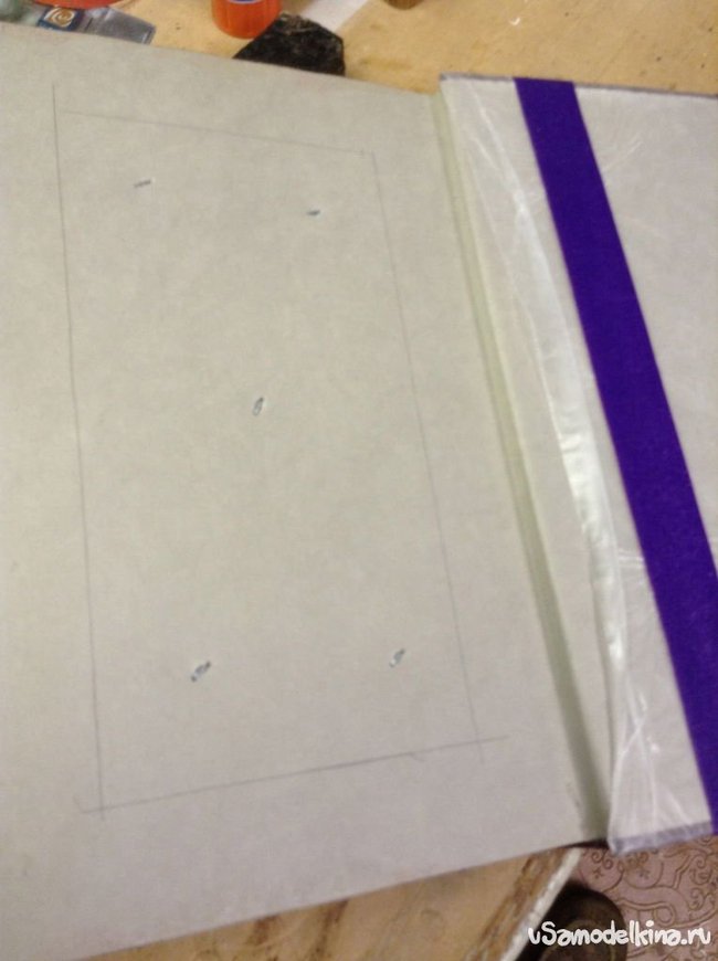 Перед тем, как взять руки пилу, определитесь с формой выемки под iPad. Это может быть любая дизайнерская задумка, но я просто решил сделать парочку бортов по бокам выемки для фиксации планшета внутри. Если вы также планируете такое решение, лучше прорисовать эти борта сейчас, пока книга еще цельная.