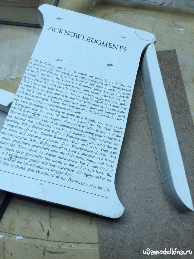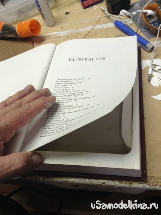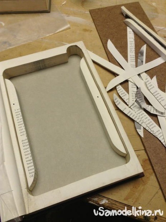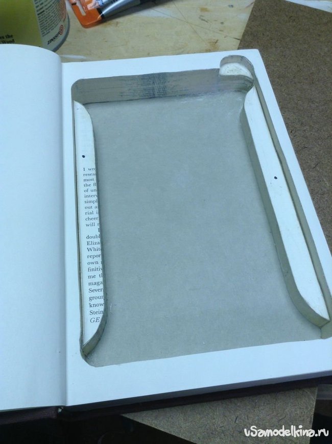 Когда странички высохли, достаньте свою пилу еще раз и вырежьте фиксаторы для книги, которые вы предварительно наметили. Далее нужно убрать часть листов сверху вырезанных бортиков до высоты самого планшета. Отрывайте понемногу. Если вдруг переборщите, верните немного страниц назад и приклейте их к оставшимся. Когда достигнете нужной высоты, проклейте внутренние грани бортиков все тем же жидким клеем.