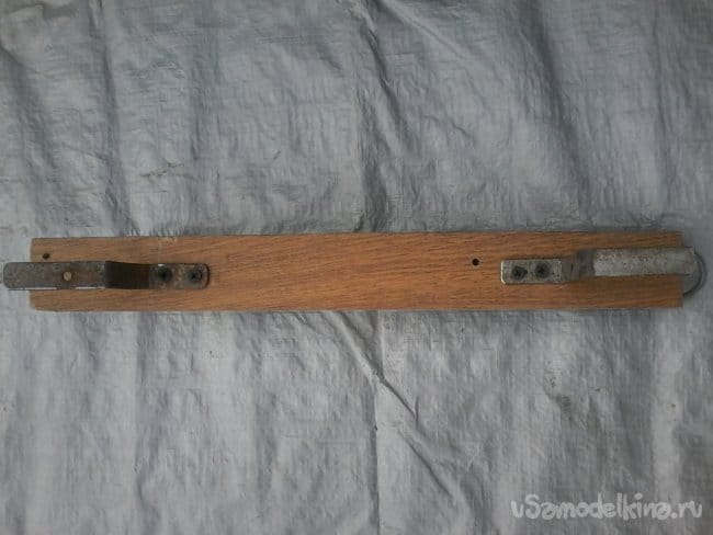 Отрезаем ножовкой по металлу две металлические пластины, указанных размеров. В тисках изгибаем их в форме буквы «Г», в нижней части каждой пластины сверлим по два отверстия диаметром 4 мм, для их крепления к рейке. Все это показано на фото. Прикрепляем пластины к длинной рейке саморезами