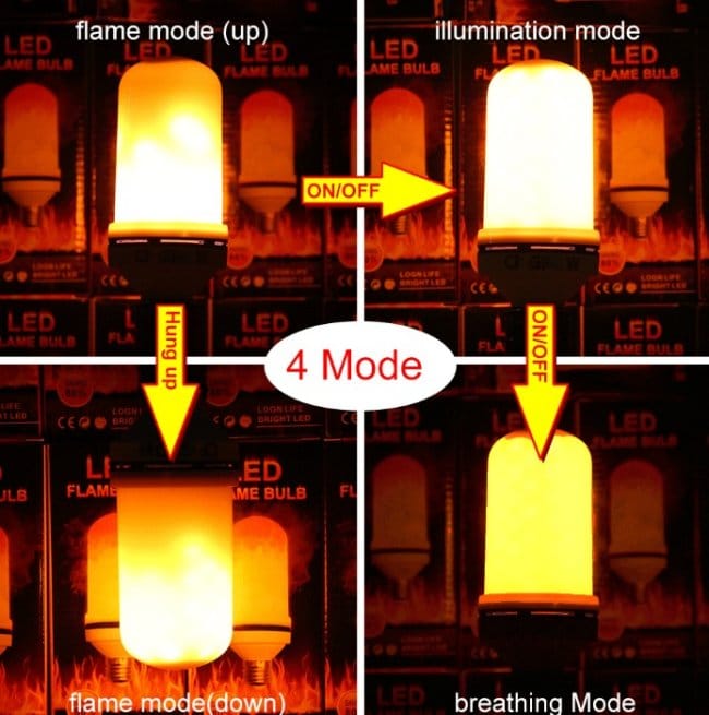 • 6 Вт / с цоколем Е27 / 3 типа свечения: равномерное, эффект пламени, эффект изменения направления пламени при переворачивании лампы / размеры: 110 мм Х 39,9 мм (длина с цоколем Х диаметр самой широкой части);