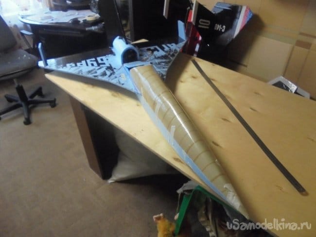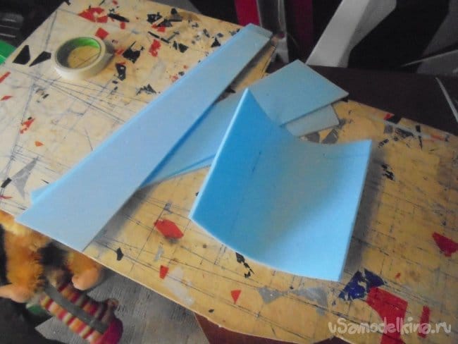 Вырезанную заготовку, верхней части фюзеляжа , предварительно обтягиваю скотчем, что бы не полопалась подложка при изгибе.
