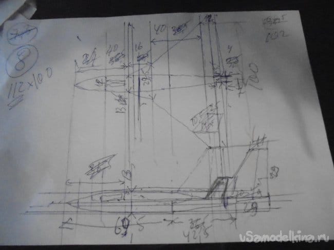 Глядя на фотографию, сделал небольшой набросочек будущей модели, проставил размеры, что бы подогнать их под характеристики импеллера и начал работать.