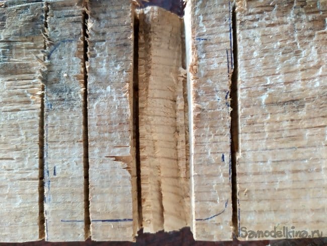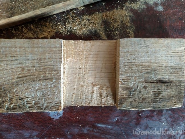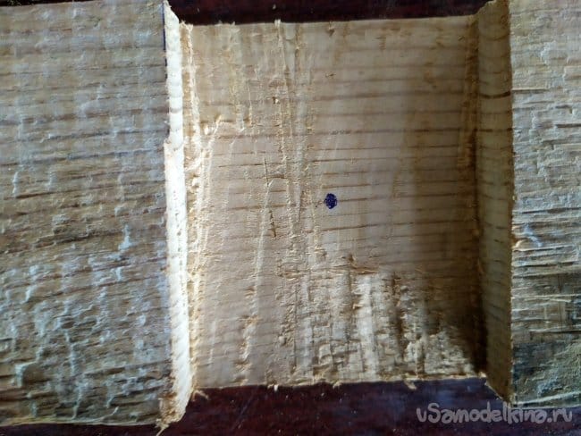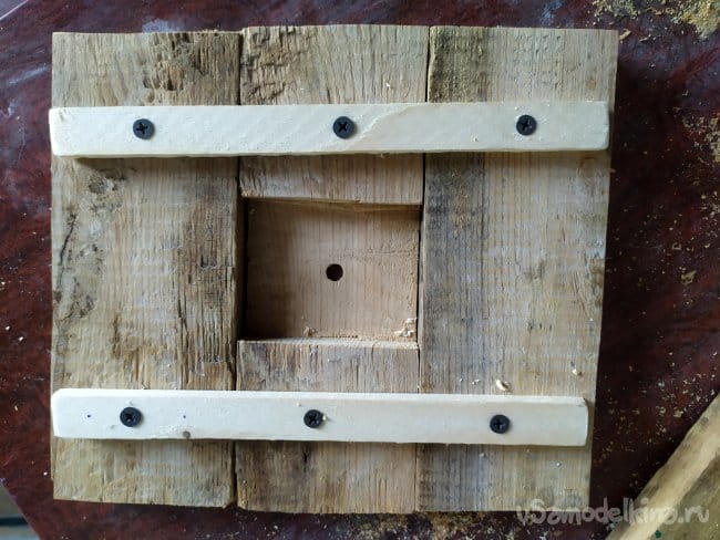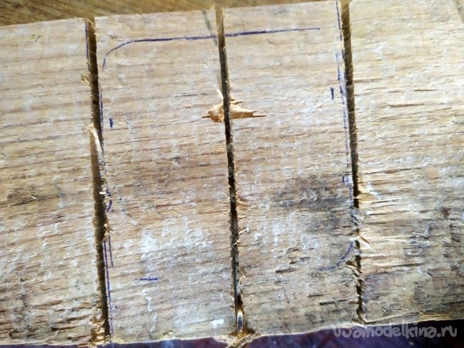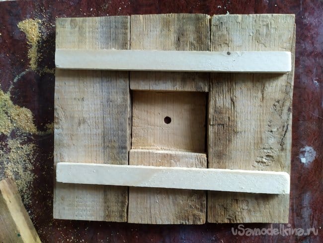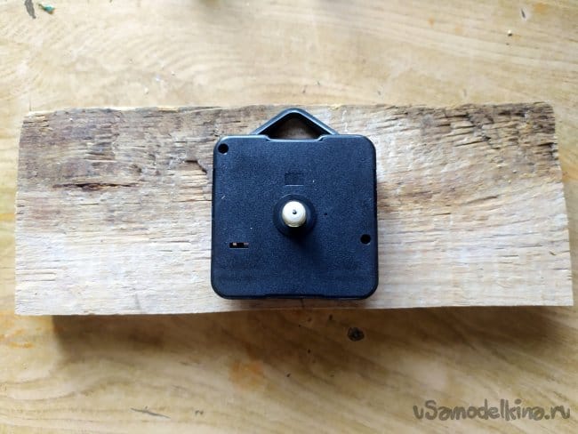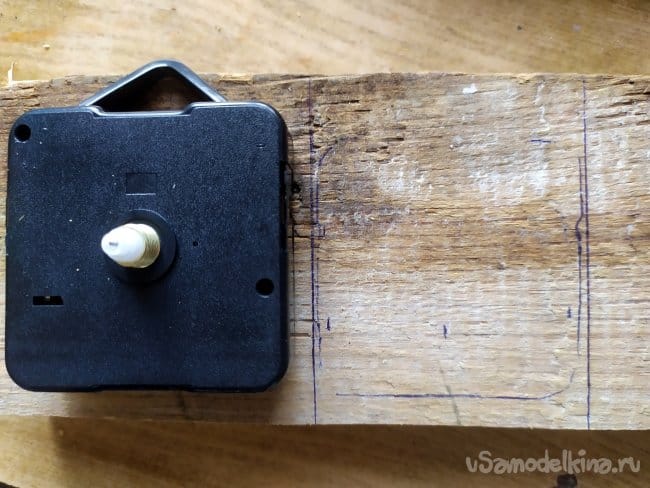 Когда вырежем перекладины, нужно будет наметить, где будет находится часовой механизм. Тут можно столкнуться с проблемой. Так как резьба на механизме оказалась невысокой, то она не может пройти через всю толщину дерева, и в следствии, закрепиться. Поэтому, нужно будет сделать для нее яму. Так как специальных инструментов у меня нет, то я использую лобзик.