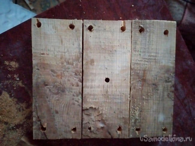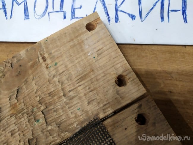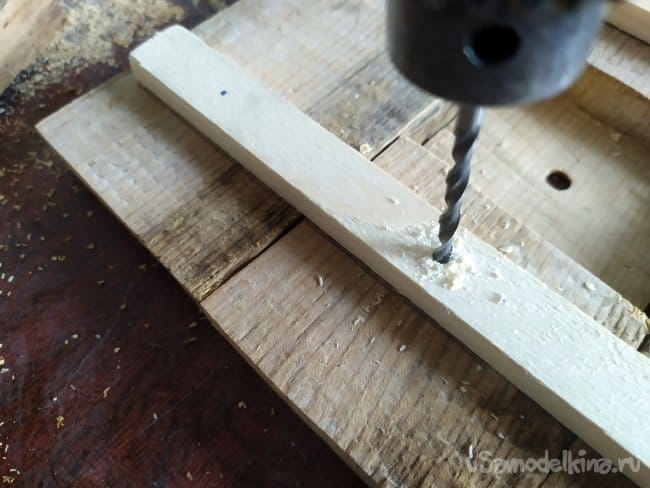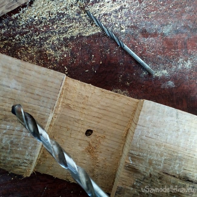 Когда отметили, нужно сделать отверстия для саморезов, чтобы дерево не треснуло. Берем тоненькое сверлышко, и сверлим. Затем, вкручиваем саморезы.