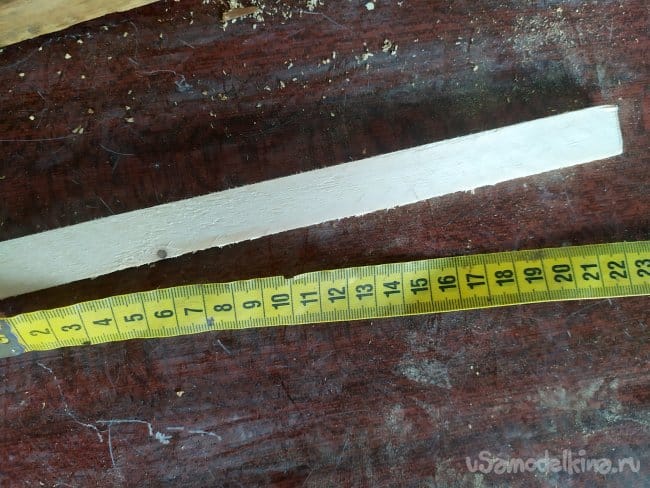 Теперь, нужно соединить все перекладины. Тут понадобится рейка, я взяла 20мм. на 10мм. Примеряем, какой длины нужно отрезать. У меня получилось 220мм.