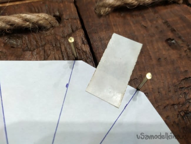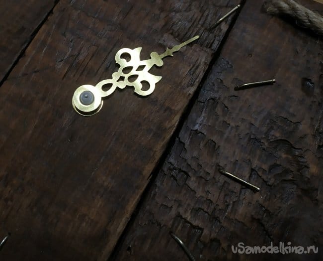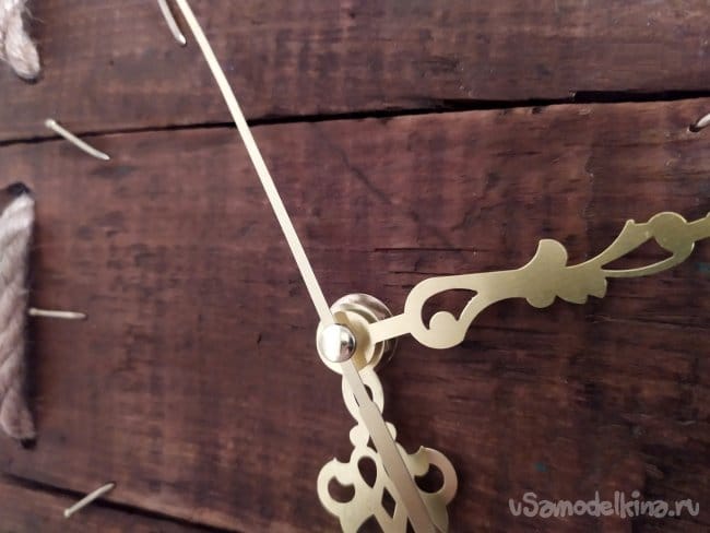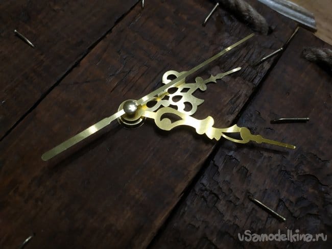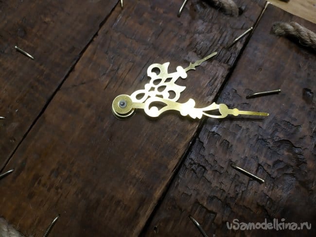 Когда закончим с гвоздиками, можно ставить стрелочки. Мои оказались немного длинные, чем нужно, и заходили на веревку, это помешало бы им идти. Поэтому, я подрезала их ножницами. Они очень тонкие, поэтому, это не составило труда. Сначала ставим стрелку часов.