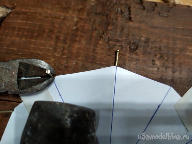 Чтобы разместить гвозди по кругу, в правильных частях, нужно сделать шаблон. Для вашего удобства, я размещу его тут, можно скачать картинку, и распечатать.