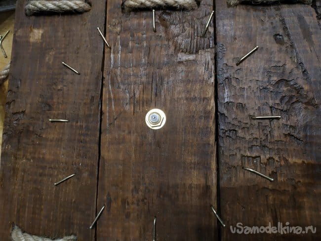 После того, как закончили с веревкой, нужно сделать что-то, типа циферблата. Конечно, можно купить и специальные циферки для часов, это сейчас не дефицит. Но я решила использовать гвозди, это выглядит интересно, и они подходят по цвету к стрелкам.