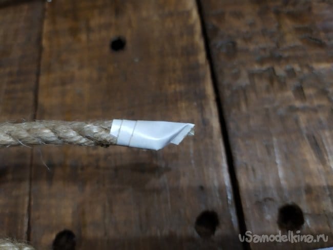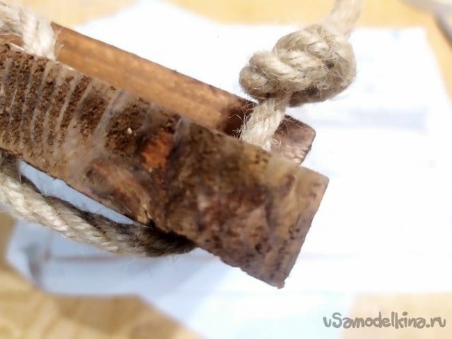Так же, веревка послужит креплением для стены. Прикладываем ее к основанию, вверху немного оставляем.