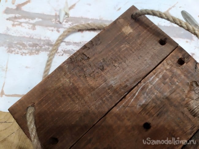 Затем, нужно просверлить. Я просверлила сначала тоненьким, затем расширила толстым. Толстое сверло должно соответствовать по размеру веревке, либо быть немного шире. Иначе, вдеть не получится.
