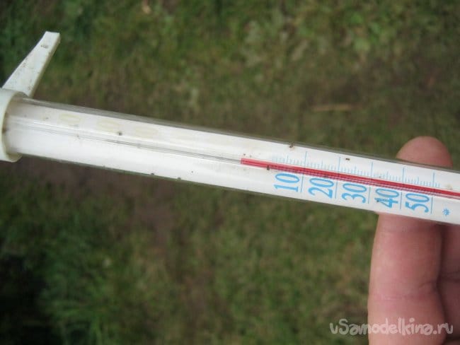 Термометр. Был наскребён из сусеков и скорее жив, чем мертв – несколько сезонов проработав в теплице, облучился на солнышке. Красная, положительная часть шкалы выцвела напрочь. Добро бы синяя, а так – странно. Тем не менее, остатки шкалы под определенным углом различались как прибор с ЖК экраном и севшими батарейками.