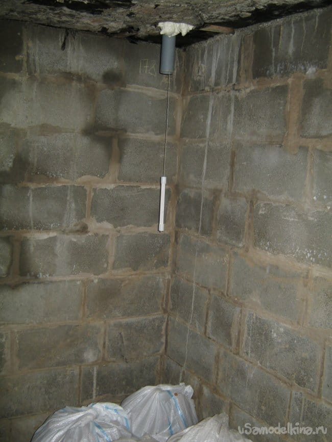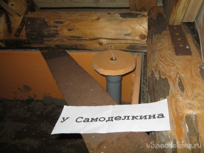 Конец веревочки пропустил через крышку из строительного плотного пенопласта, чтобы узелок не промял мягкую крышку, ограничил ему свободу самодельной шайбой из монетки (50 коп.). Значительный диаметр пенопластовой крышки позволяет перекрыть горловину трубы в любом горизонтальном положении веревочки.