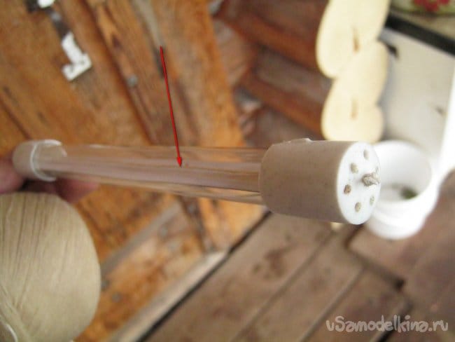 Через отверстия центральные пропустил нитку, внутри термометра она проходит позади шкалы. Нитка была использована вощенная (пропарафиненная) используемая в бытность при радиомонтаже. Такими вязали жгуты проводов при радио- и электро- монтаже до широкого распространения пластикового крепежа – всяких там ремешков, хомутиков, площадок, сеточек и спиралек. Получился термометр на ниточке. Висит ровно и надежно.