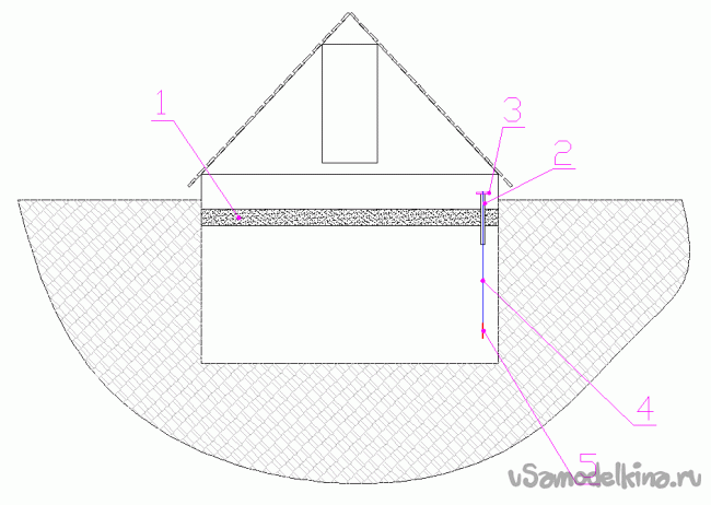 Схема измерения температуры в погребе, без раскупоривания его и спуска «оператора» вниз, где: 1 - перекрытие погреба; 2 – трубка-шахта для спуска термометра; 3 – крышка; 4 – нить; 5 – спиртовой термометр.