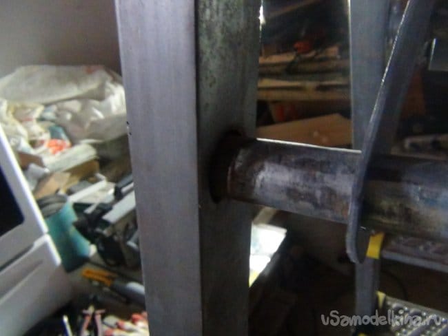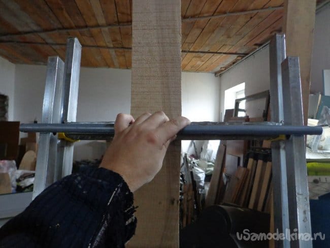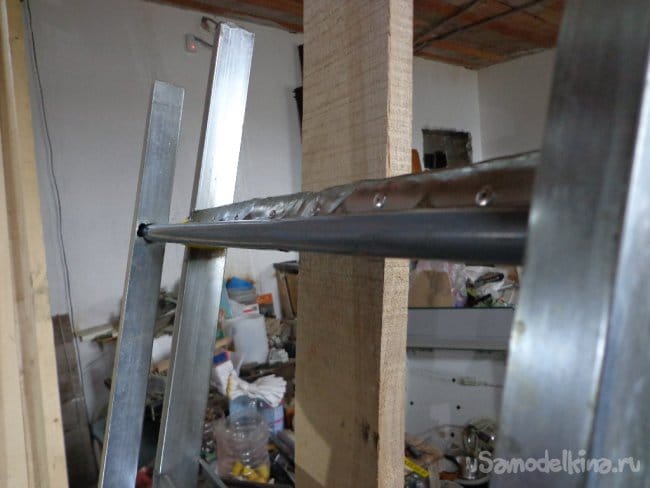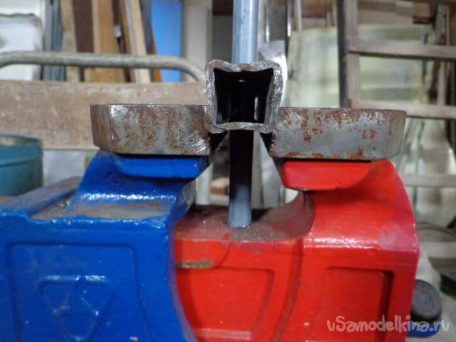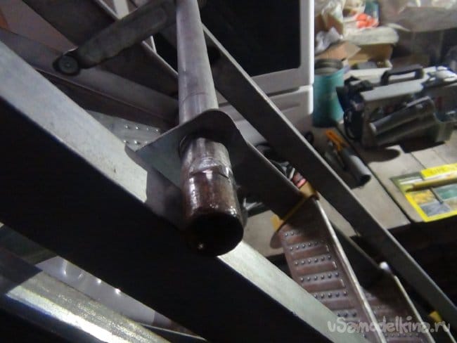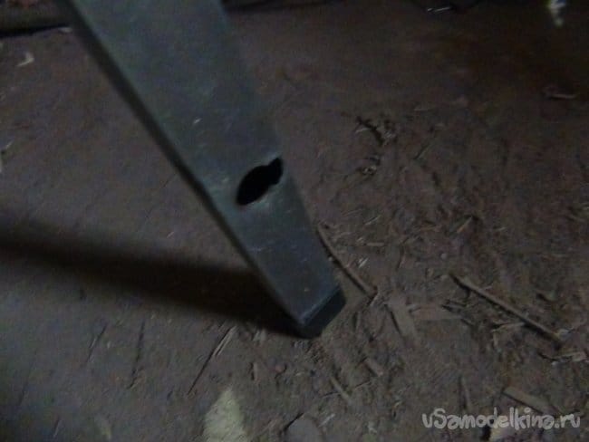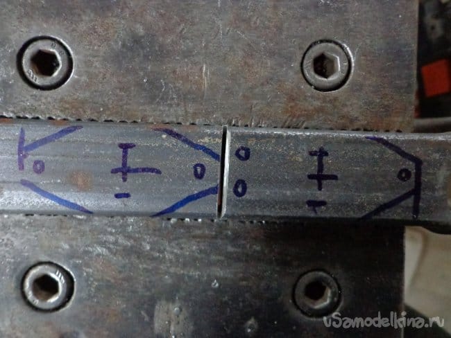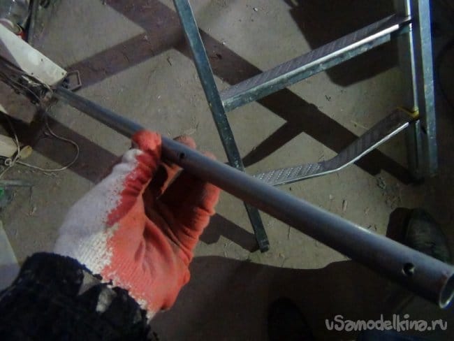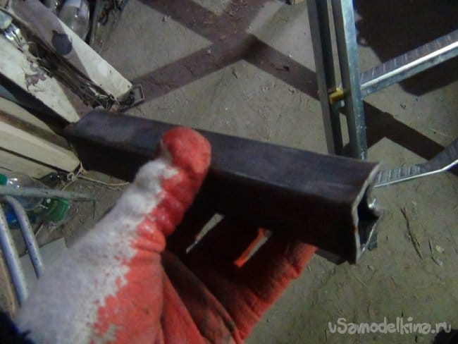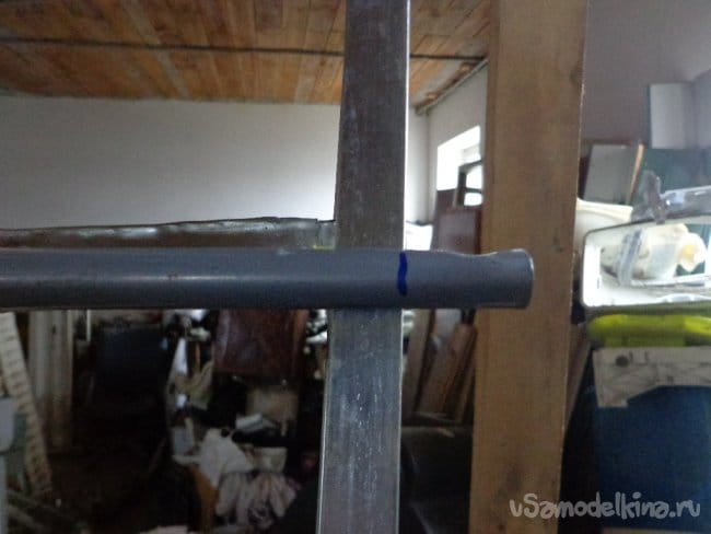 Подвинул задние ножки на один уровень с опорами лесенки, и разметил по трубке края будущего среза. Отрезал из того расчёта, чтобы концы трубки упирались в стенки проф.трубы изнутри, далее объясню для чего.