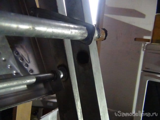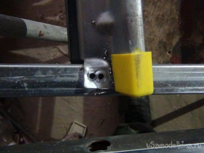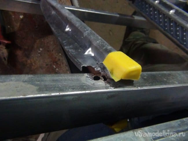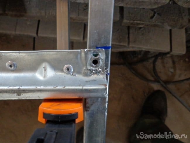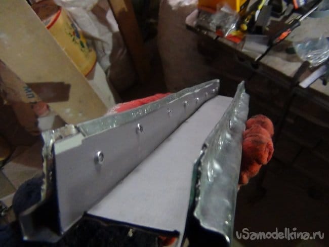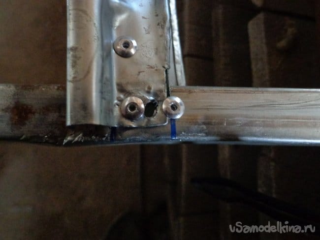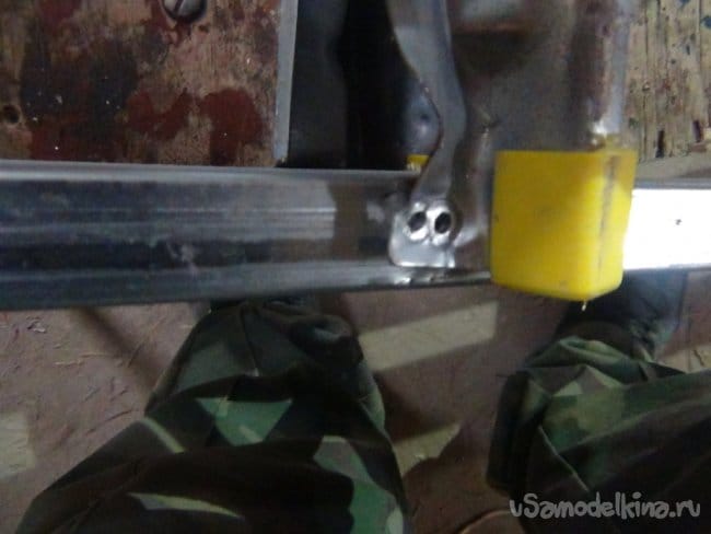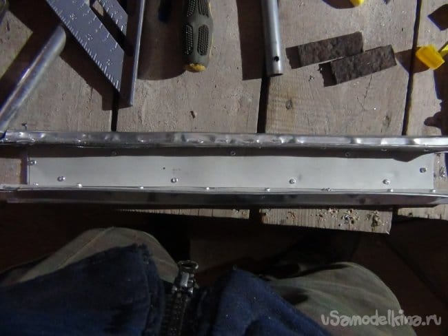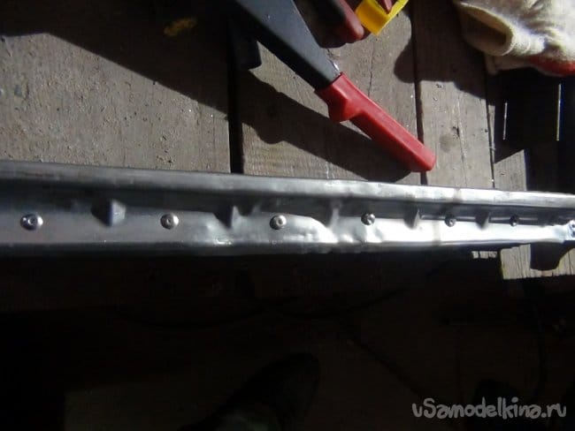 Для того чтобы усилитель работал, проклепал заклёпками 4х8 по всей длине меж заводскими усилителями, которые должны поддерживать порог от прогиба, но идея не оправдала себя.